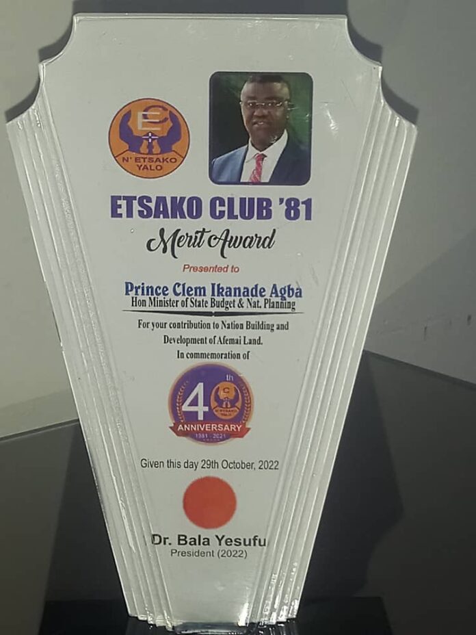 Prince Clem Ikanade Agba, Minister of State, Budget and National Planning, was one of the sons and daughters of Etsako that were honoured for their developmental strides in the land at the Etsako Club 81 40th anniversary.