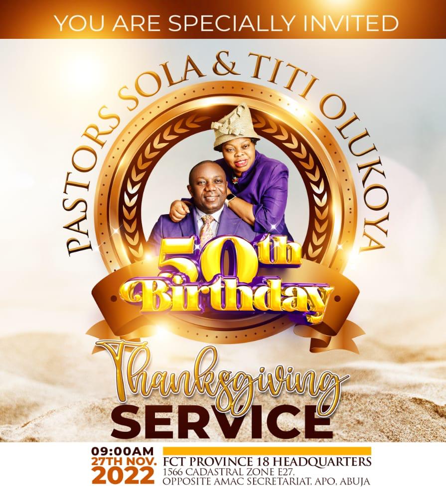 Pastor Sola and Pastor (Mrs.) Titi Olukoya are celebrating their 50th year birthday today, 27th November 2022 at the Number 18 Provincial Headquarters of the Ark of Distinction of the Redeemed Christian Church of God in Abuja.